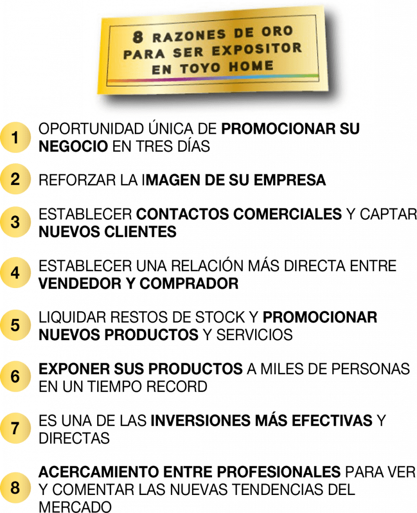El otro objetivo de Toyo Home es que sus expositores potencien sus ventas, capten nuevos clientes y servir de gran escaparate para sus PRODUCTOS Y MARCA.